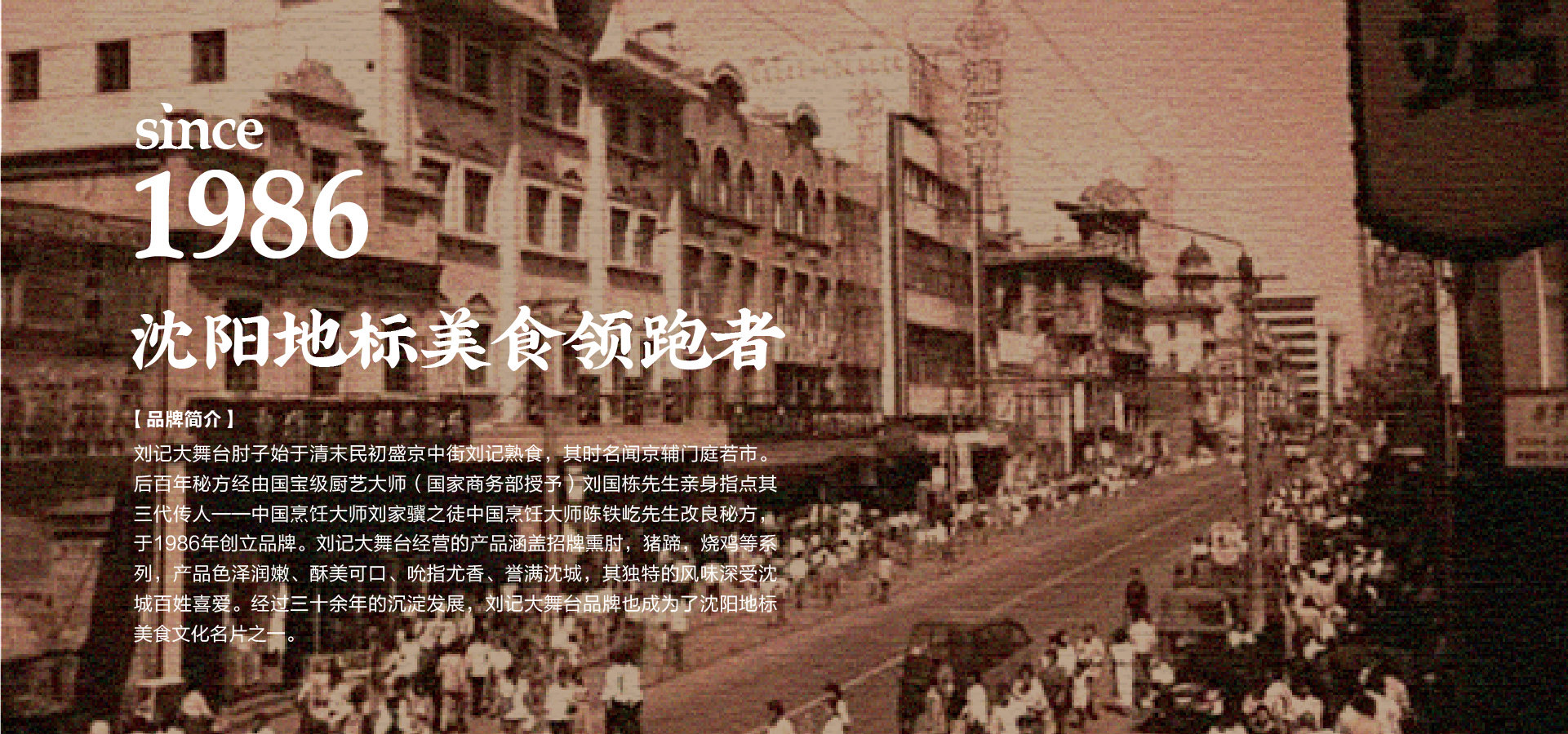 品牌創(chuàng)始人陳鐵屹先生自幼師承遼菜正宗,以發(fā)揚(yáng)傳承遼味為己任。1986年,陳鐵屹先生經(jīng)師傅指導(dǎo)調(diào)制出第一鍋醬湯,自此開(kāi)始制作熟食,并于市井銷售,食客絡(luò)繹不絕。作為中華美食的傳承者、開(kāi)拓者和創(chuàng)新者,陳鐵屹先生于80年代創(chuàng)立“劉記大舞臺(tái)肘子”品牌,開(kāi)出了第一家門店。基于百年秘方傳承改良,并采用新鮮放心原料,秘用二十幾味名貴藥材,延用傳統(tǒng)工藝專心加工而成,形成了色澤艷麗,酥爛脫骨,肥而不膩,瘦而不柴的風(fēng)味產(chǎn)品。